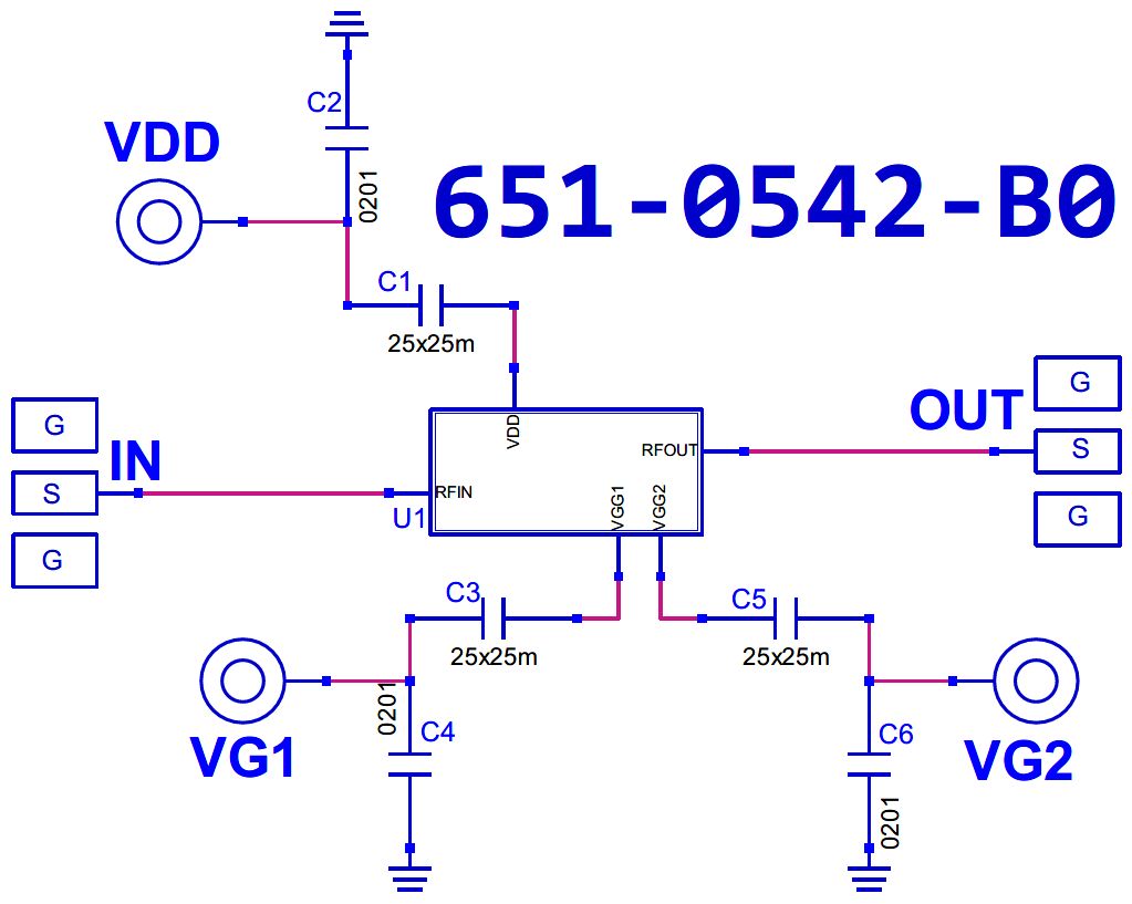 1. Apply VG1 = -2.0V 2. Apply VDD = 5.0V 3. Apply VG2 = +1.4V 4. Adjust VG1 more positive until IDQ reaches 65mA Note: VG1 ~ -TBDV, Do not exceed 0.0V 5. Apply the RF input signal Power-down Sequence 1. Turn off the RF input signal 2. Adjust VG1 to -2.0V 3. Adjust VG2 to 0V 4. Adjust VDD to 0V 5. Adjust VG1 to 0V |