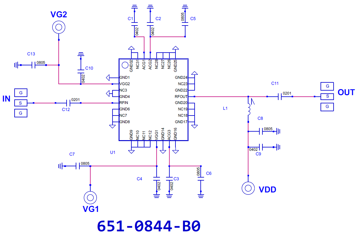 Power-up Sequence 1. Apply VDD = 12.0V Verify IDD ~345mA 2. Apply RF Input Power-down Sequence 1. Remove RF Input 2. Turn off VDD Note: VGG1 = GND, VGG2 = Open, for nominal self biased operation. |